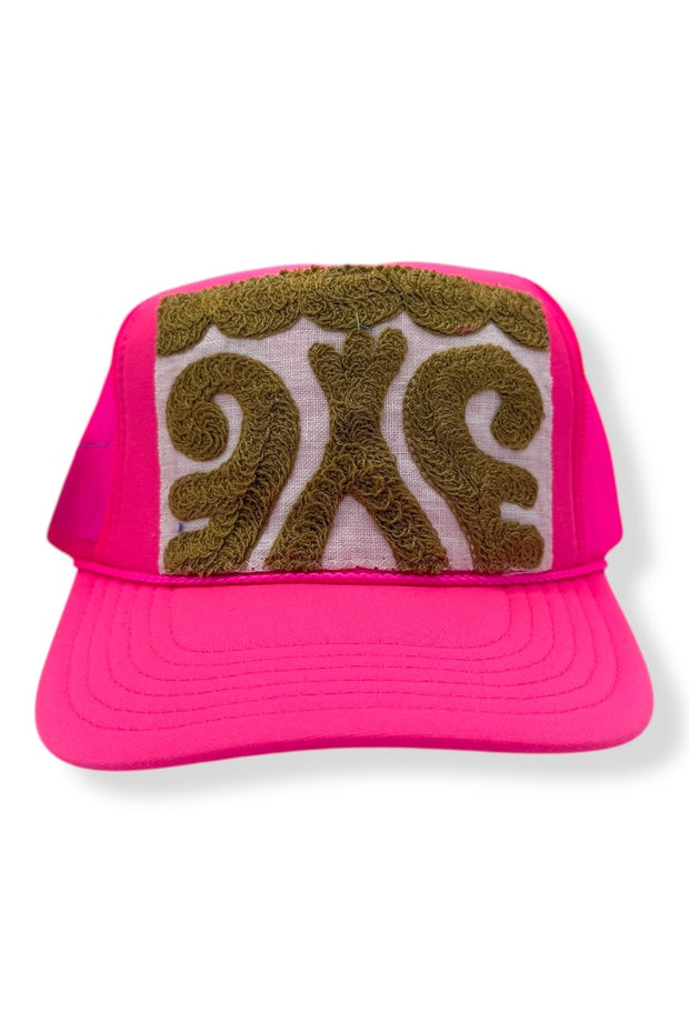 Your easy, throw-on-and-go, trucker with Turkish kilim patch. No two are alike! One size hat with structured bill and mesh back with adjustable snaps. Each piece has been stitched to ensure quality and discourage fraying (Fraying adds character your collectable) while maintaining the integrity of the fabric. However, due to the nature of the textiles, some fraying may occur. Additionally, color variations & imperfections should be expected as the norm. Wear with care!