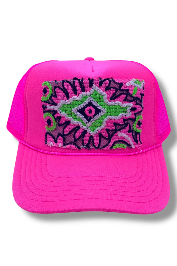 Your easy, throw-on-and-go, trucker with Turkish kilim patch. No two are alike! One size hat with structured bill and mesh back with adjustable snaps. Each piece has been stitched to ensure quality and discourage fraying (Fraying adds character your collectable) while maintaining the integrity of the fabric. However, due to the nature of the textiles, some fraying may occur. Additionally, color variations & imperfections should be expected as the norm. Wear with care!