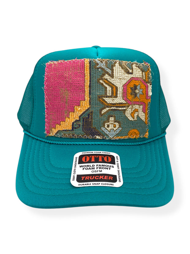 Your easy, throw-on-and-go, trucker with Turkish kilim patch. No two are alike! One size hat with structured bill and mesh back with adjustable snaps. Each piece has been stitched to ensure quality and discourage fraying (Fraying adds character your collectable) while maintaining the integrity of the fabric. However, due to the nature of the textiles, some fraying may occur. Additionally, color variations & imperfections should be expected as the norm. Wear with care!