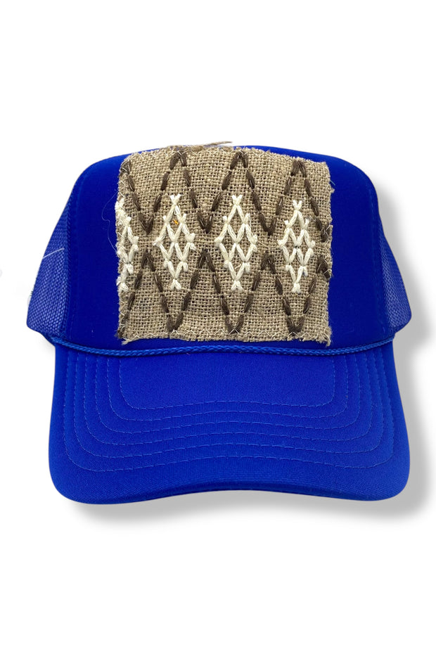 Your easy, throw-on-and-go, trucker with Turkish kilim patch. No two are alike! One size hat with structured bill and mesh back with adjustable snaps. Each piece has been stitched to ensure quality and discourage fraying (Frayering adds character your collectable) while maintaining the integrity of the fabric. However, due to the nature of the textiles, some fraying may occur. Additionally, color variations & imperfections should be expected as the norm. Wear with care!