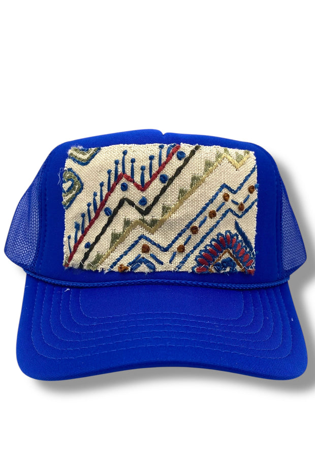 Your easy, throw-on-and-go, trucker with Turkish kilim patch. No two are alike! One size hat with structured bill and mesh back with adjustable snaps. Each piece has been stitched to ensure quality and discourage fraying (Frayering adds character your collectable) while maintaining the integrity of the fabric. However, due to the nature of the textiles, some fraying may occur. Additionally, color variations & imperfections should be expected as the norm. Wear with care!