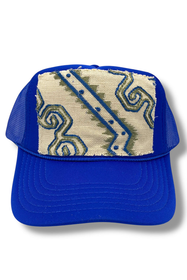 Your easy, throw-on-and-go, trucker with Turkish kilim patch. No two are alike! One size hat with structured bill and mesh back with adjustable snaps. Each piece has been stitched to ensure quality and discourage fraying (Frayering adds character your collectable) while maintaining the integrity of the fabric. However, due to the nature of the textiles, some fraying may occur. Additionally, color variations & imperfections should be expected as the norm. Wear with care!