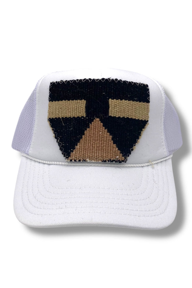 Your easy, throw-on-and-go, trucker with Turkish kilim patch. No two are alike! One size hat with structured bill and mesh back with adjustable snaps. Each piece has been stitched to ensure quality and discourage fraying (Fraying adds character your collectable) while maintaining the integrity of the fabric. However, due to the nature of the textiles, some fraying may occur. Additionally, color variations & imperfections should be expected as the norm. Wear with care!