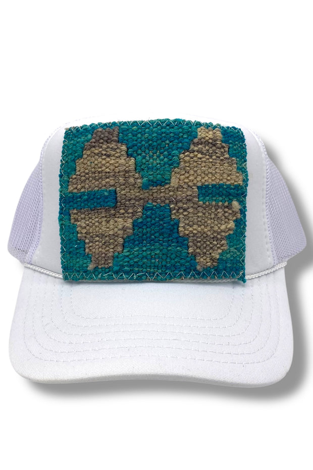Your easy, throw-on-and-go, trucker with Turkish kilim patch. No two are alike! One size hat with structured bill and mesh back with adjustable snaps. Each piece has been stitched to ensure quality and discourage fraying (Fraying adds character your collectable) while maintaining the integrity of the fabric. However, due to the nature of the textiles, some fraying may occur. Additionally, color variations & imperfections should be expected as the norm. Wear with care!