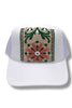 Your easy, throw-on-and-go, trucker with Turkish kilim patch. No two are alike! One size hat with structured bill and mesh back with adjustable snaps. Each piece has been stitched to ensure quality and discourage fraying (Fraying adds character your collectable) while maintaining the integrity of the fabric. However, due to the nature of the textiles, some fraying may occur. Additionally, color variations & imperfections should be expected as the norm. Wear with care!