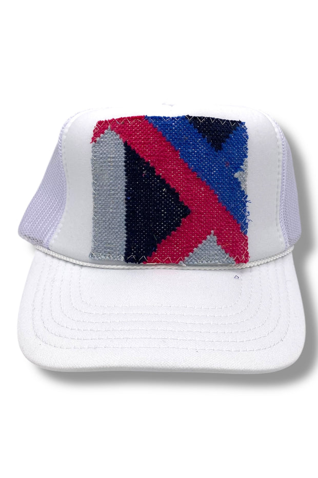 Your easy, throw-on-and-go, trucker with Turkish kilim patch. No two are alike! One size hat with structured bill and mesh back with adjustable snaps. Each piece has been stitched to ensure quality and discourage fraying (Fraying adds character your collectable) while maintaining the integrity of the fabric. However, due to the nature of the textiles, some fraying may occur. Additionally, color variations & imperfections should be expected as the norm. Wear with care!