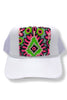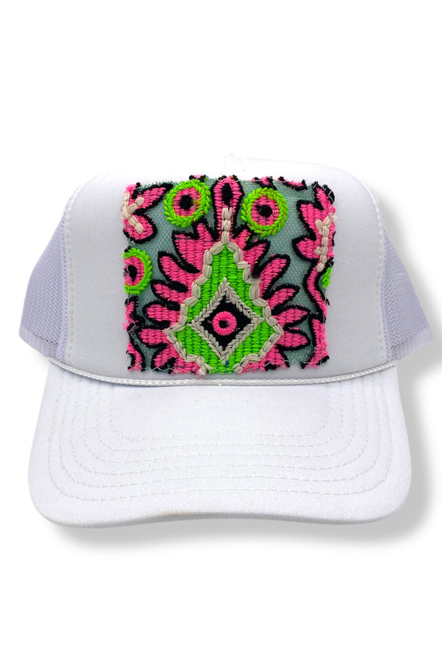 Your easy, throw-on-and-go, trucker with Turkish kilim patch. No two are alike! One size hat with structured bill and mesh back with adjustable snaps. Each piece has been stitched to ensure quality and discourage fraying (Fraying adds character your collectable) while maintaining the integrity of the fabric. However, due to the nature of the textiles, some fraying may occur. Additionally, color variations & imperfections should be expected as the norm. Wear with care!