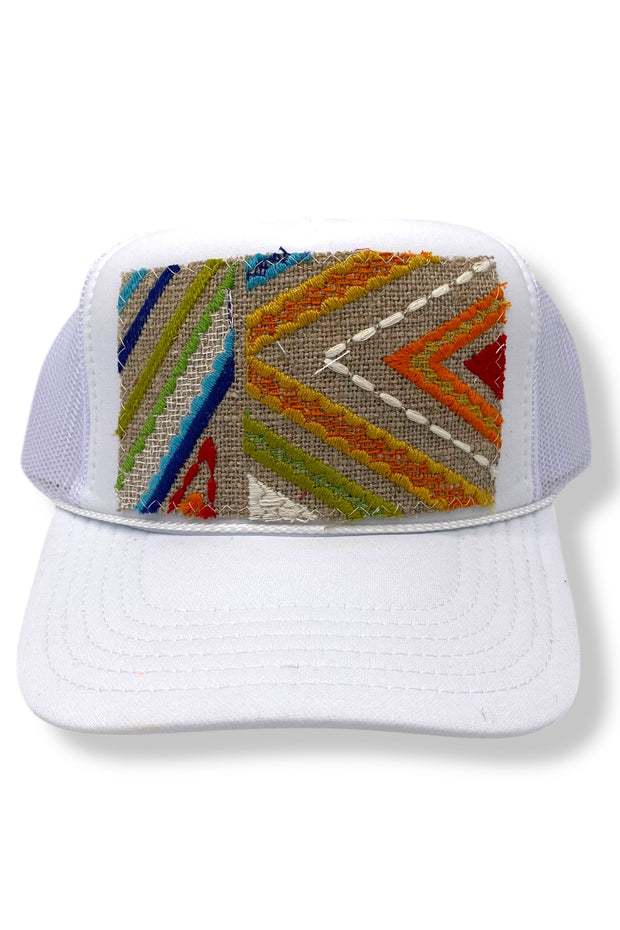 Your easy, throw-on-and-go, trucker with Turkish kilim patch. No two are alike! One size hat with structured bill and mesh back with adjustable snaps. Each piece has been stitched to ensure quality and discourage fraying (Fraying adds character your collectable) while maintaining the integrity of the fabric. However, due to the nature of the textiles, some fraying may occur. Additionally, color variations & imperfections should be expected as the norm. Wear with care!