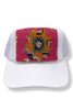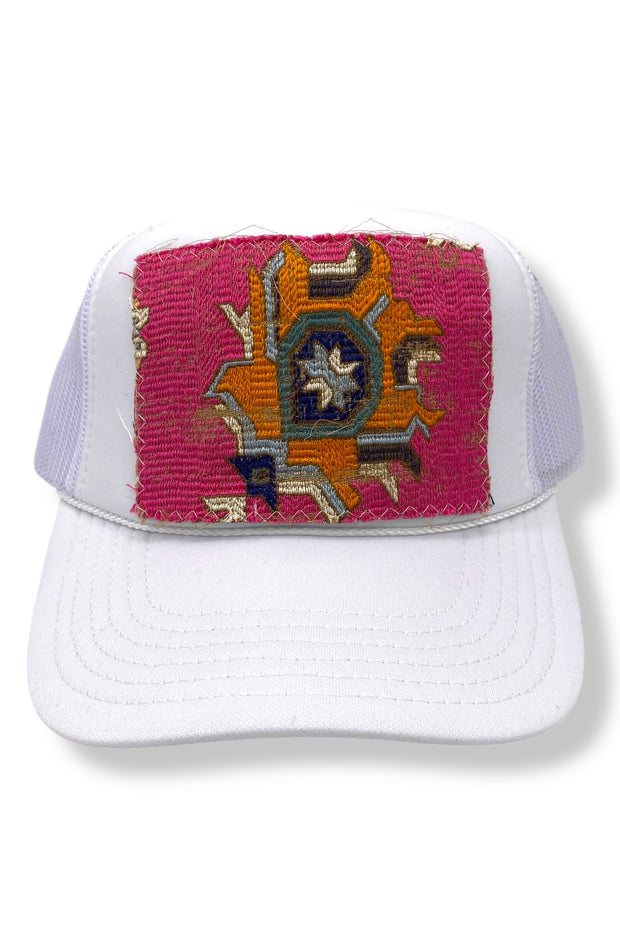 Your easy, throw-on-and-go, trucker with Turkish kilim patch. No two are alike! One size hat with structured bill and mesh back with adjustable snaps. Each piece has been stitched to ensure quality and discourage fraying (Fraying adds character your collectable) while maintaining the integrity of the fabric. However, due to the nature of the textiles, some fraying may occur. Additionally, color variations & imperfections should be expected as the norm. Wear with care!