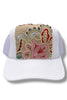 Your easy, throw-on-and-go, trucker with Turkish kilim patch. No two are alike! One size hat with structured bill and mesh back with adjustable snaps. Each piece has been stitched to ensure quality and discourage fraying (Fraying adds character your collectable) while maintaining the integrity of the fabric. However, due to the nature of the textiles, some fraying may occur. Additionally, color variations & imperfections should be expected as the norm. Wear with care!