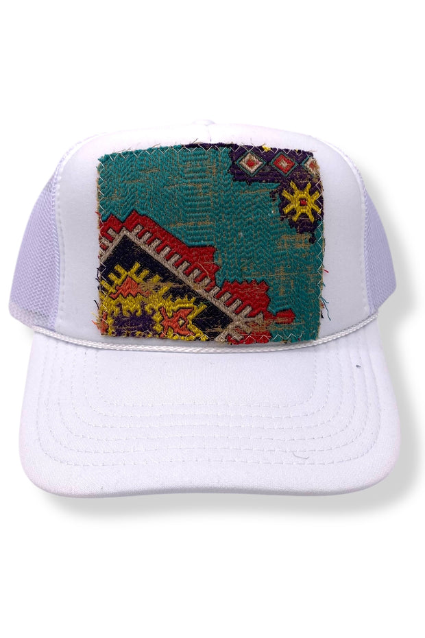 Your easy, throw-on-and-go, trucker with Turkish kilim patch. No two are alike! One size hat with structured bill and mesh back with adjustable snaps. Each piece has been stitched to ensure quality and discourage fraying (Fraying adds character your collectable) while maintaining the integrity of the fabric. However, due to the nature of the textiles, some fraying may occur. Additionally, color variations & imperfections should be expected as the norm. Wear with care!