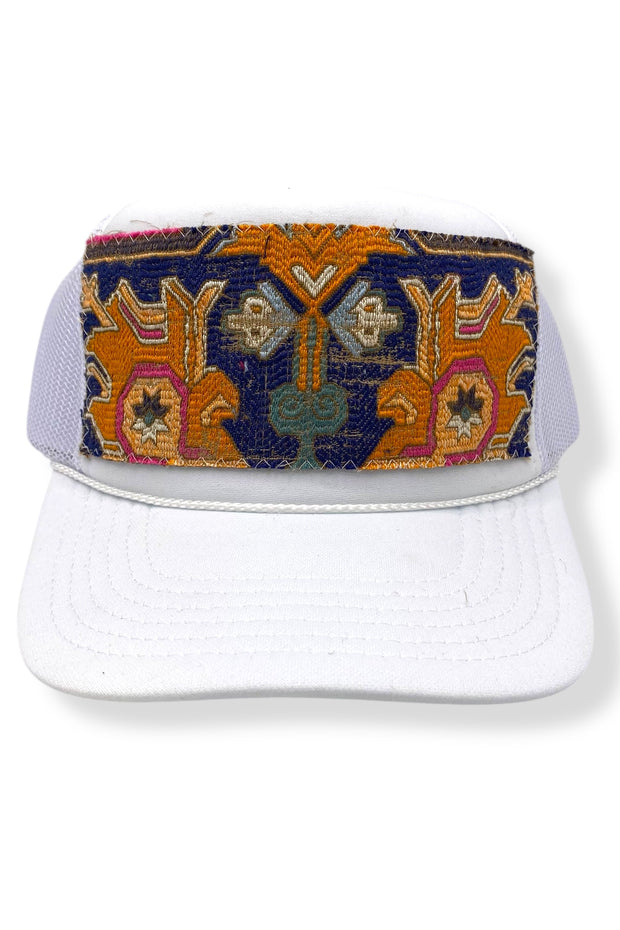 Your easy, throw-on-and-go, trucker with Turkish kilim patch. No two are alike! One size hat with structured bill and mesh back with adjustable snaps. Each piece has been stitched to ensure quality and discourage fraying (Fraying adds character your collectable) while maintaining the integrity of the fabric. However, due to the nature of the textiles, some fraying may occur. Additionally, color variations & imperfections should be expected as the norm. Wear with care!