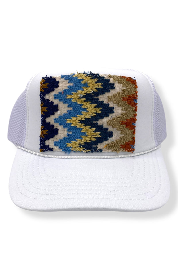 Your easy, throw-on-and-go, trucker with Turkish kilim patch. No two are alike! One size hat with structured bill and mesh back with adjustable snaps. Each piece has been stitched to ensure quality and discourage fraying (Fraying adds character your collectable) while maintaining the integrity of the fabric. However, due to the nature of the textiles, some fraying may occur. Additionally, color variations & imperfections should be expected as the norm. Wear with care!