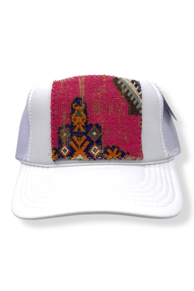 Your easy, throw-on-and-go, trucker with Turkish kilim patch. No two are alike! One size hat with structured bill and mesh back with adjustable snaps. Each piece has been stitched to ensure quality and discourage fraying (Fraying adds character your collectable) while maintaining the integrity of the fabric. However, due to the nature of the textiles, some fraying may occur. Additionally, color variations & imperfections should be expected as the norm. Wear with care!