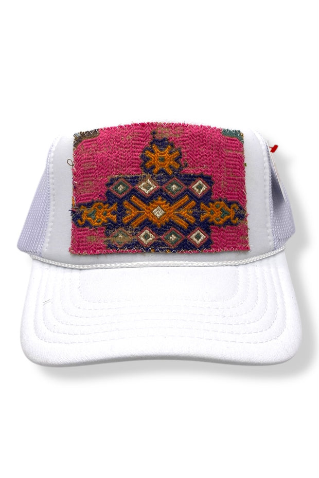 Your easy, throw-on-and-go, trucker with Turkish kilim patch. No two are alike! One size hat with structured bill and mesh back with adjustable snaps. Each piece has been stitched to ensure quality and discourage fraying (Fraying adds character your collectable) while maintaining the integrity of the fabric. However, due to the nature of the textiles, some fraying may occur. Additionally, color variations & imperfections should be expected as the norm. Wear with care!