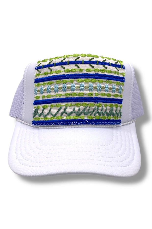 Your easy, throw-on-and-go, trucker with Turkish kilim patch. No two are alike! One size hat with structured bill and mesh back with adjustable snaps. Each piece has been stitched to ensure quality and discourage fraying (Fraying adds character your collectable) while maintaining the integrity of the fabric. However, due to the nature of the textiles, some fraying may occur. Additionally, color variations & imperfections should be expected as the norm. Wear with care!