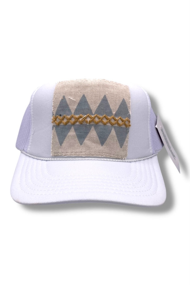 Your easy, throw-on-and-go, trucker with Turkish kilim patch. No two are alike! One size hat with structured bill and mesh back with adjustable snaps. Each piece has been stitched to ensure quality and discourage fraying (Fraying adds character your collectable) while maintaining the integrity of the fabric. However, due to the nature of the textiles, some fraying may occur. Additionally, color variations & imperfections should be expected as the norm. Wear with care!
