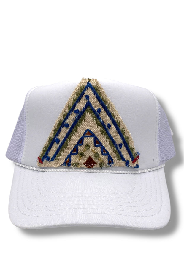 Your easy, throw-on-and-go, trucker with Turkish kilim patch. No two are alike! One size hat with structured bill and mesh back with adjustable snaps. Each piece has been stitched to ensure quality and discourage fraying (Fraying adds character your collectable) while maintaining the integrity of the fabric. However, due to the nature of the textiles, some fraying may occur. Additionally, color variations & imperfections should be expected as the norm. Wear with care!