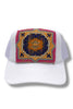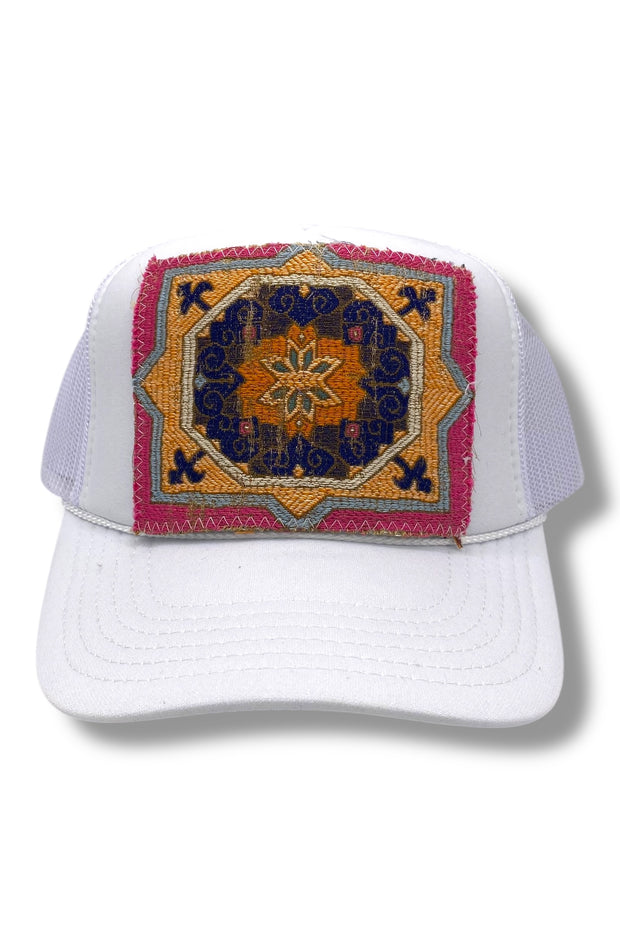 Your easy, throw-on-and-go, trucker with Turkish kilim patch. No two are alike! One size hat with structured bill and mesh back with adjustable snaps. Each piece has been stitched to ensure quality and discourage fraying (Fraying adds character your collectable) while maintaining the integrity of the fabric. However, due to the nature of the textiles, some fraying may occur. Additionally, color variations & imperfections should be expected as the norm. Wear with care!