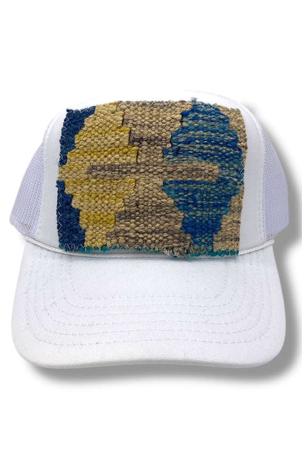 Your easy, throw-on-and-go, trucker with Turkish kilim patch. No two are alike! One size hat with structured bill and mesh back with adjustable snaps. Each piece has been stitched to ensure quality and discourage fraying (Fraying adds character your collectable) while maintaining the integrity of the fabric. However, due to the nature of the textiles, some fraying may occur. Additionally, color variations & imperfections should be expected as the norm. Wear with care!