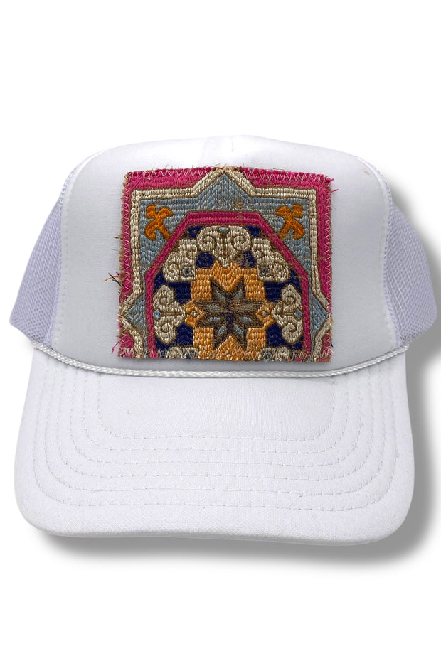 Your easy, throw-on-and-go, trucker with Turkish kilim patch. No two are alike! One size hat with structured bill and mesh back with adjustable snaps. Each piece has been stitched to ensure quality and discourage fraying (Fraying adds character your collectable) while maintaining the integrity of the fabric. However, due to the nature of the textiles, some fraying may occur. Additionally, color variations & imperfections should be expected as the norm. Wear with care!