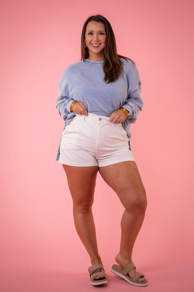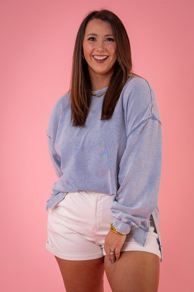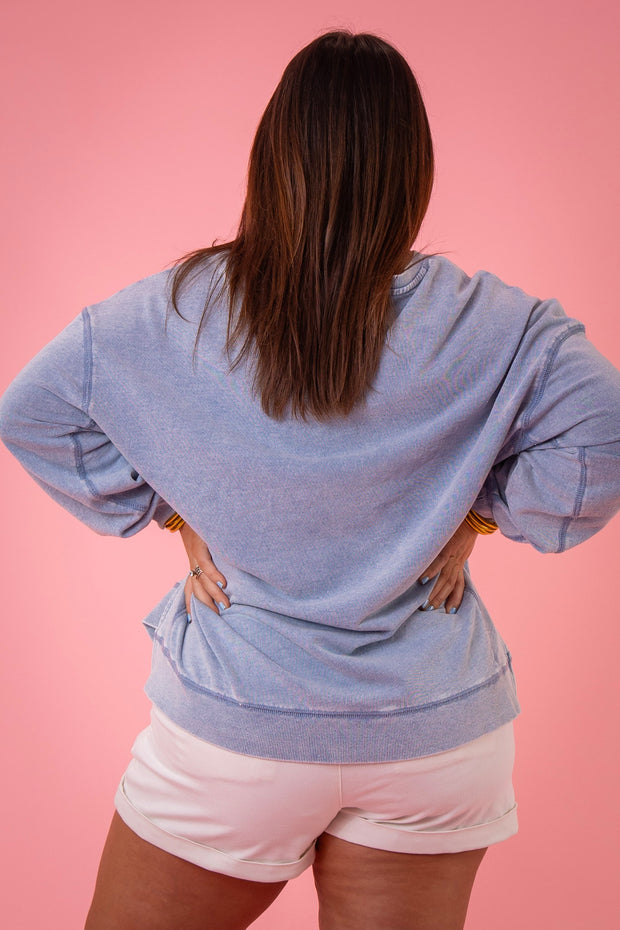 • Stephanie is wearing a size large in washed indigo.