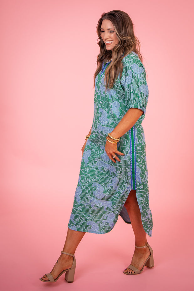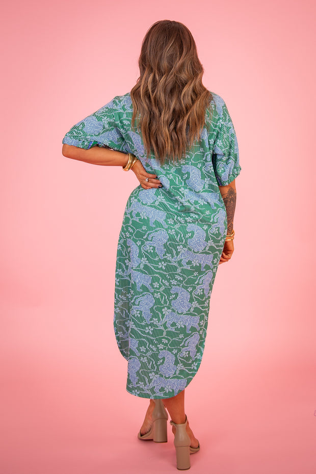 Showcase your fierce style with the Poppy Kaftan by Emily McCarthy. This kaftan features a top collar, v-neckline, and short sleeves for a comfortable yet fashionable look. The tiger detailing throughout adds a bold touch to this must-have piece. Elevate your wardrobe with this statement piece from a renowned industry expert.
