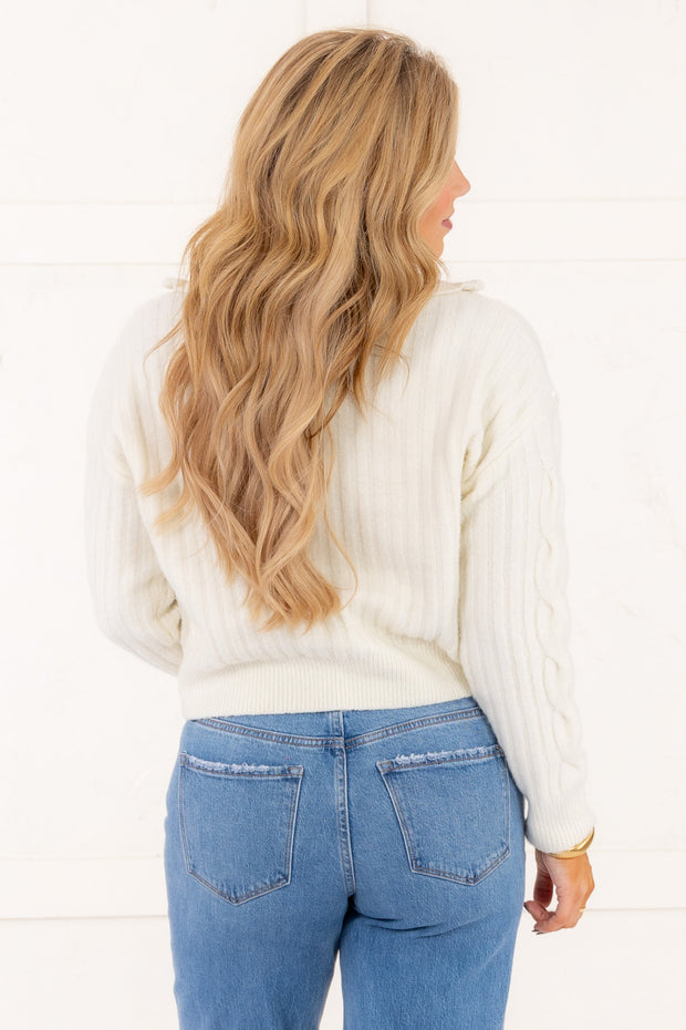 The Free Spirit Pullover Sweater features a top collar and long sleeves, making it the perfect transitional piece for any season. It is crafted from soft and cozy knitted material, and is adorned with clear sequins throughout, adding a touch of sparkle to your wardrobe. Stay stylish and comfortable with this versatile sweater.