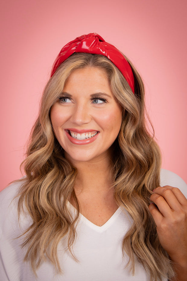 Elevate your outfit with our elegant Lady in Red Headband. Made from soft, premium patent leather, this knotted headband adds a touch of sophistication to any look. With a trendy twist on a classic design, it's the perfect accessory for achieving a polished and stylish look.