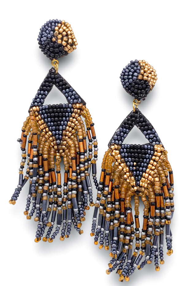 These stunning, eye-catching, earrings are super fun! These earrings would look so good with sweaters. The earrings feature a fully beaded look with an aztec design, a triangle cutout, and beaded tassels.