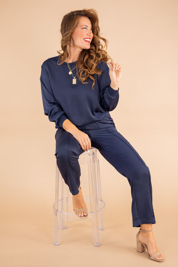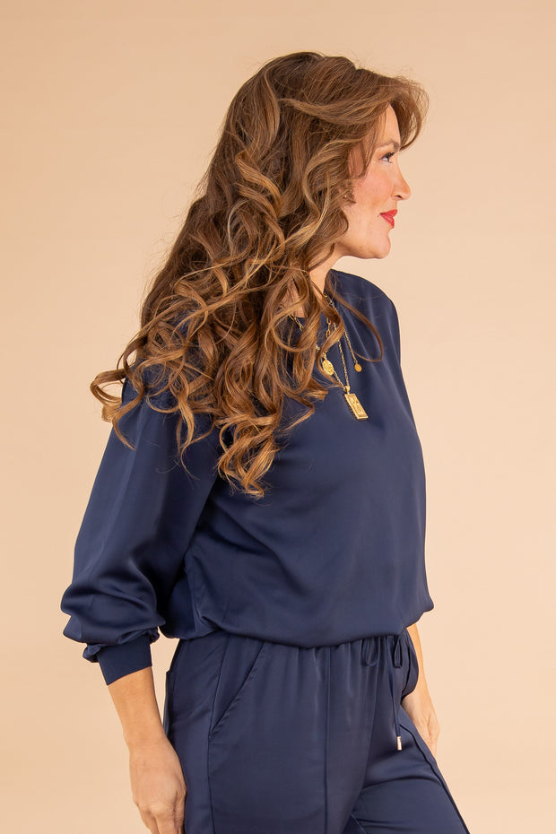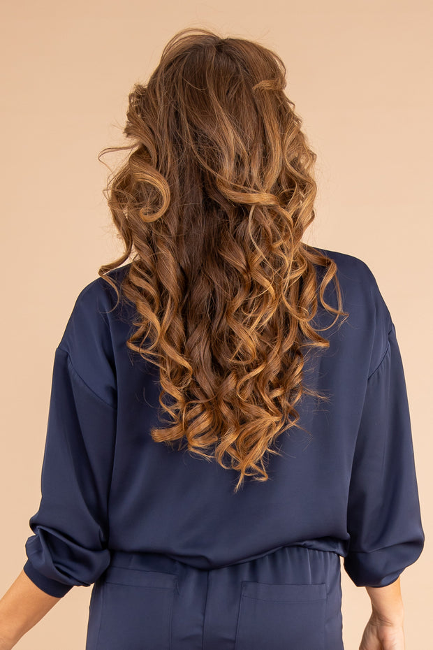 The Midnight Sky Top boasts a rounded neckline and long sleeves, perfect for a polished yet comfortable look. Its silky material adds a touch of luxury, while the elastic banded hemline offers a flattering fit for all body types. A must-have addition to any wardrobe.