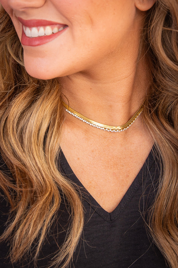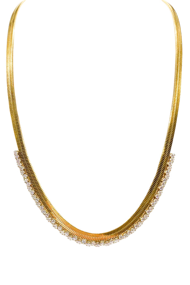 The Larisa Necklace is a stunning statement piece, featuring a beautiful herringbone design adorned with sparkling crystal pavé accents for a hint of glamor. Crafted with precision and attention to detail, this necklace is perfect for making an elegant fashion statement.