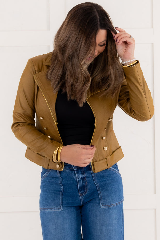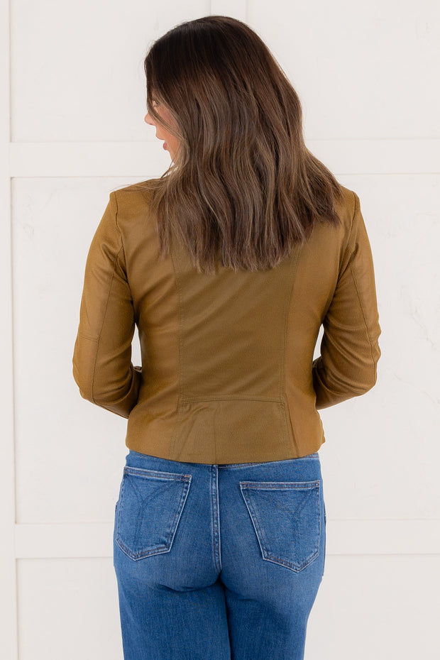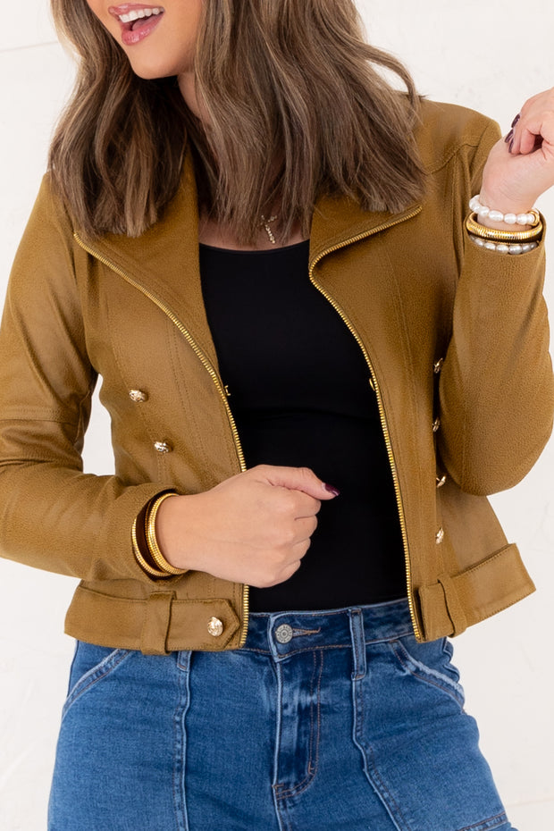This top collar, waist length moto jacket is made with high-quality faux leather material. Its long sleeves and zip down front provide both style and functionality. Perfect for any occasion, it's the essential staple for anyone looking to make a statement.
