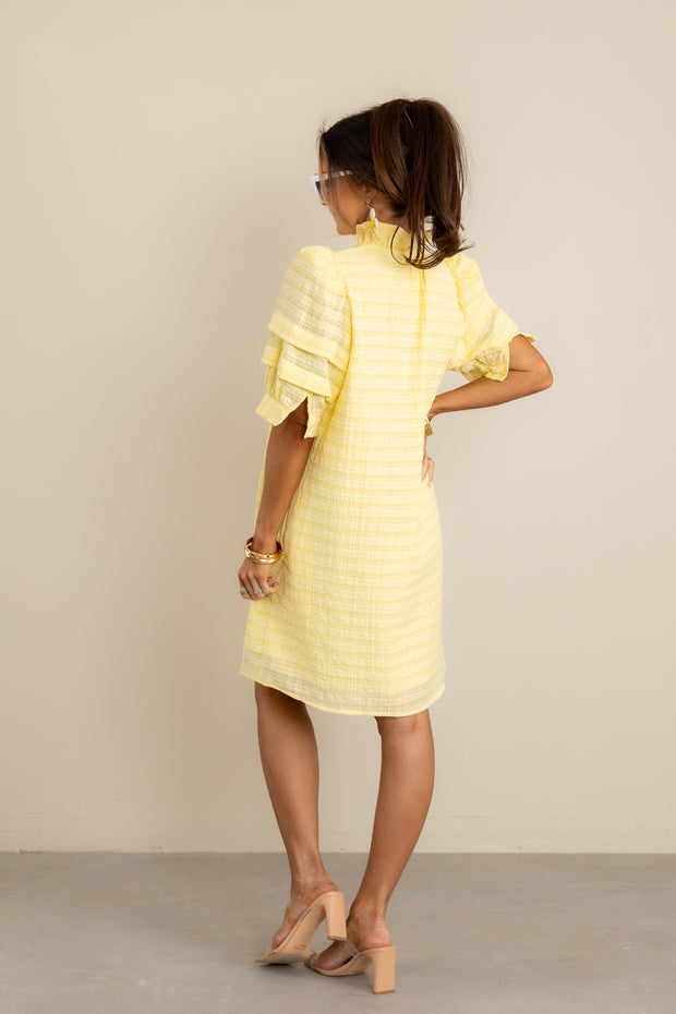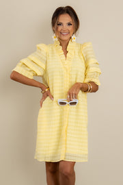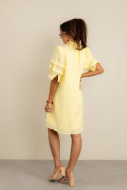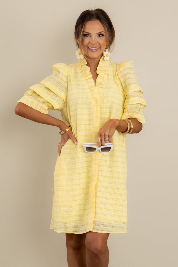 Featuring a button-down front and ruffled top collar, this dress exudes sophistication. The short sleeves and mini length add a touch of playfulness.