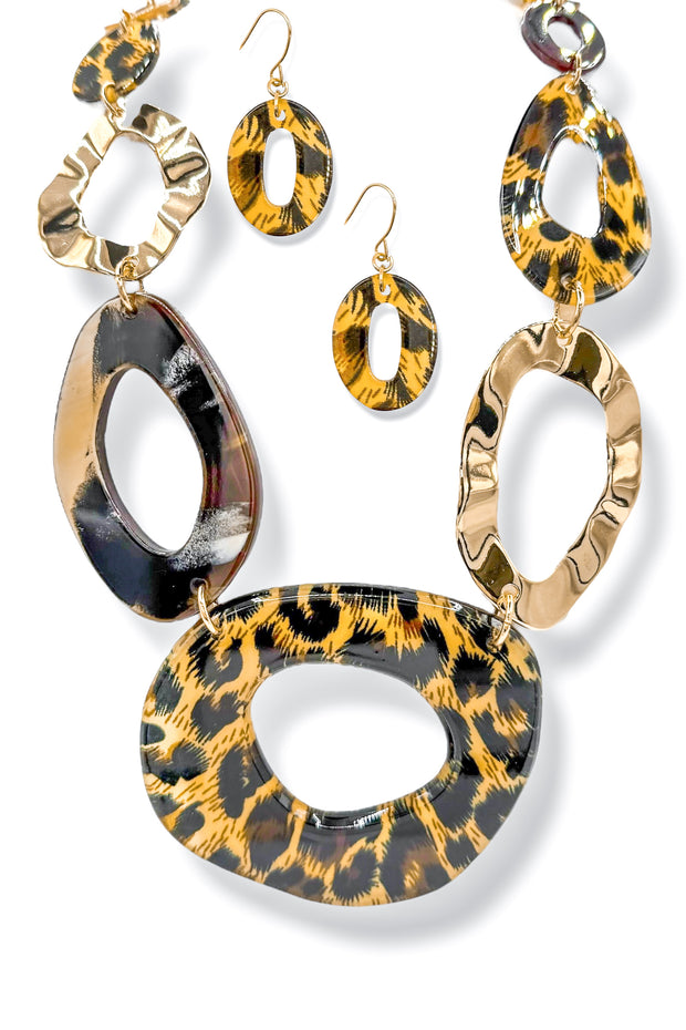 Featuring an abstract, open oval link design made of leopard print celluloid acetate metal. With a unique and eye-catching design, this necklace is the perfect statement piece to add to your wardrobe.