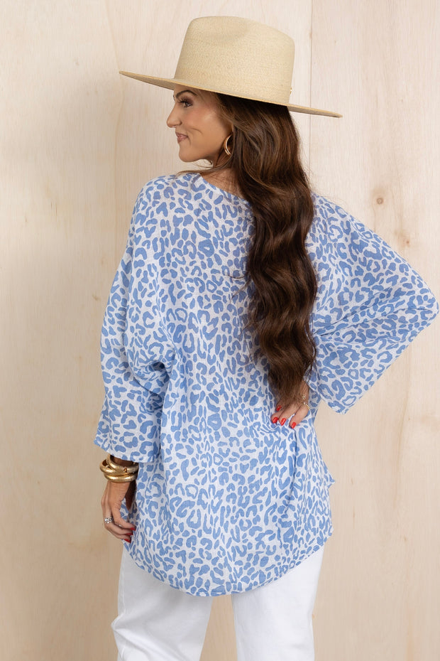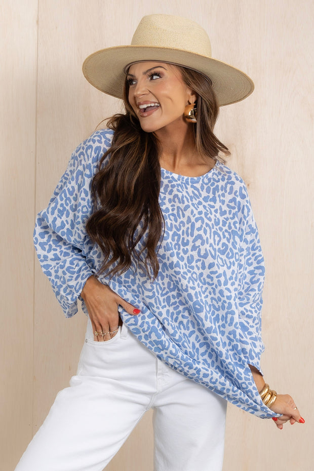 Expertly crafted with breathable material this Top combines comfort and style. The striking blue leopard print adds a touch of fierceness to the classic round neckline.