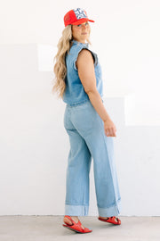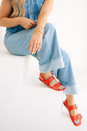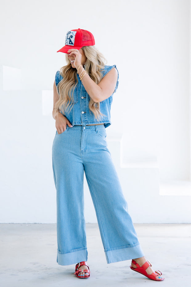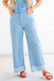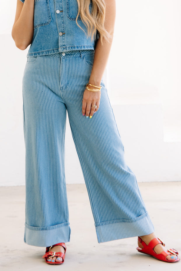 These light blue wide leg pants feature a front zip button closure for easy wear, practical side pockets, and a stylish striped print. The cuffed wide leg bottom adds a relaxed, comfortable fit perfect for everyday wear.