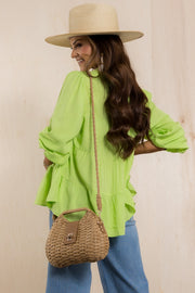 Made with breathable material, this top features a button down design and a top collar for a polished look. The bright lime green color adds a pop of color to your outfit. Perfect for any occasion, this top is also long-sleeved and tiered for added style.
