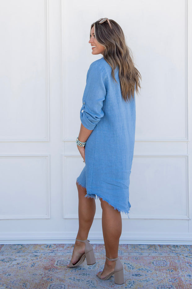This stylish Straight For You Linen Dress is made with high-quality linen material, providing a comfortable and breathable fit. The top collar and long sleeves add a touch of sophistication, while the button down front allows for easy wear. The distressed hem line adds a modern edge, making this dress perfect for any occasion.
