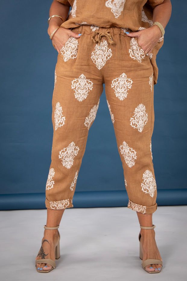 Expertly crafted from luxurious linen material, the Andrea Linen Pant boasts an elastic pull on waistband for ultimate comfort. With convenient side pockets and a trendy cropped silhouette, this pant is perfect for any occasion. Its eye-catching abstract print adds a touch of sophistication to your wardrobe.