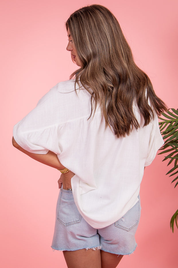 Show off your sense of style with our Worth Your While Top. This elegant ivory top features a trendy top collar and short sleeves, perfect for any occasion. Made with a linen-like material, this button down top will keep you both comfortable and fashionable.