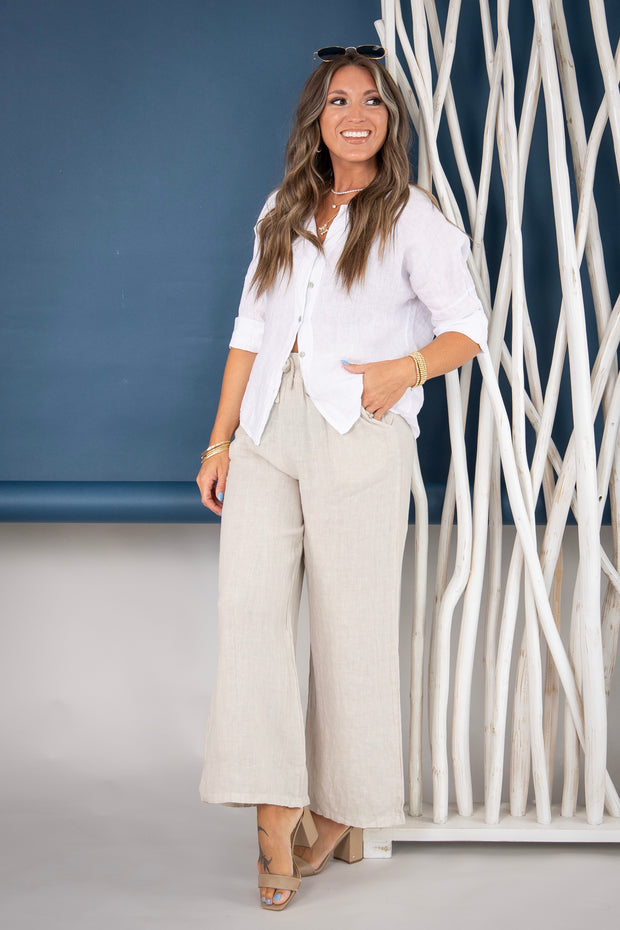 From a product expert: These linen pants are crafted with a pull-on waistband and functional drawstring, making them easy to slip on and adjust for maximum comfort. Along with the convenient side pockets, these pants are perfect for any casual occasion.