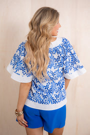This top features a beautiful blue and white eyelet pattern with a distinctive thick white hemline. The flattering v-neckline adds a feminine touch to this long sleeve design. Made from breathable, comfortable material that keeps you feeling fresh throughout the day while the delicate eyelet detailing provides elegant visual interest.