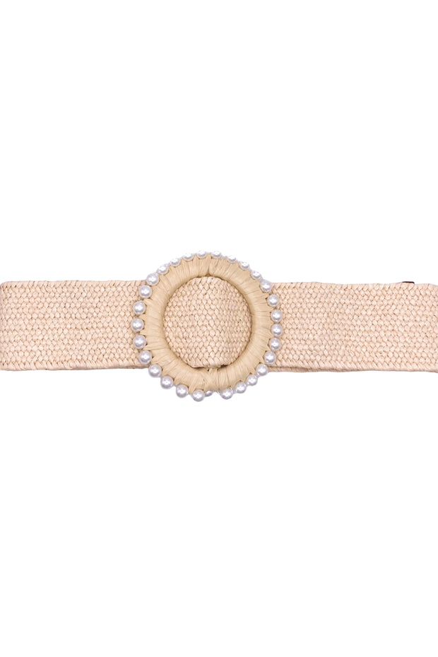 Tie your outfit together with Lotte Belt. With a beautiful natural color, faux pearls lining the circular buckle, and a little extra stretch from the elastic material, this adjustable waist piece is the perfect accessory to complete your look.