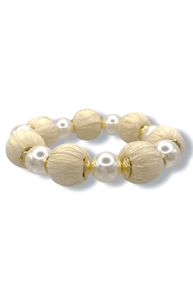 The Lover of Spring Bracelet is a stunning addition to any outfit. Featuring a delicate combination of pearls, raffia, and gold beads, this bracelet exudes effortless elegance. Perfect for adding a touch of sophistication to your everyday look.