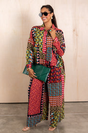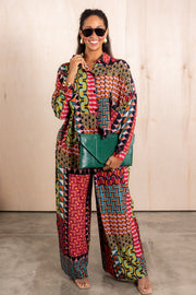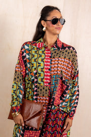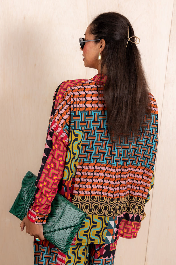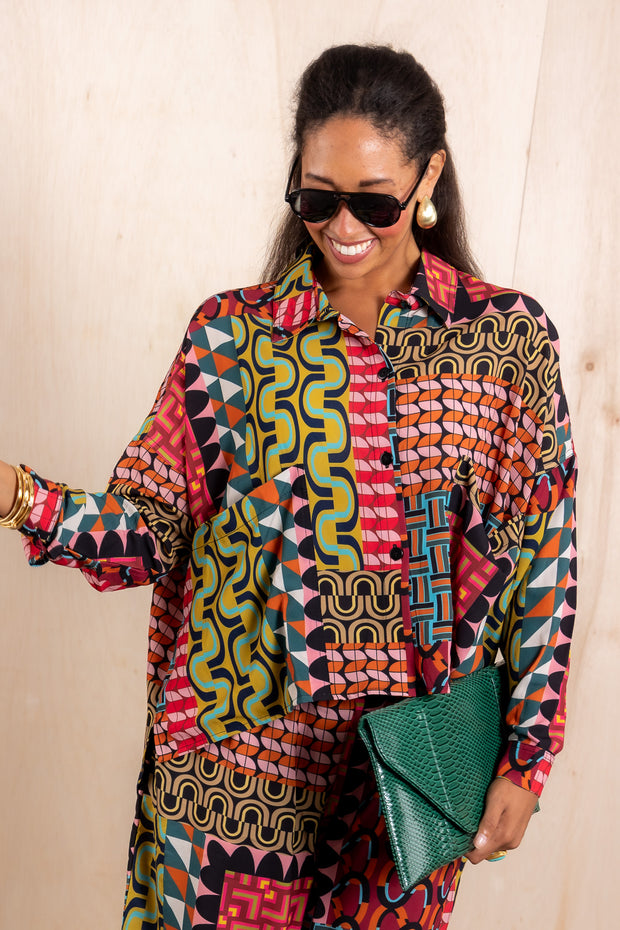 This Blouse combines a top collar and long sleeves with a stylish high-low silhouette. Its abstract print adds a unique touch, while front pockets offer practical convenience.