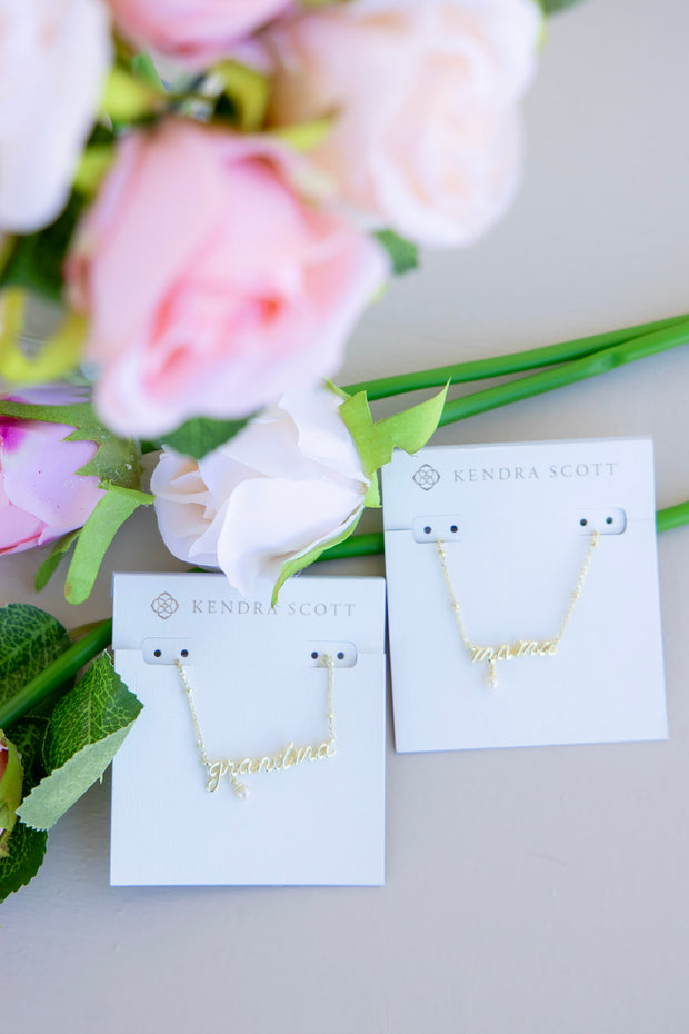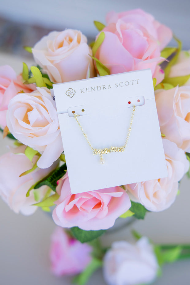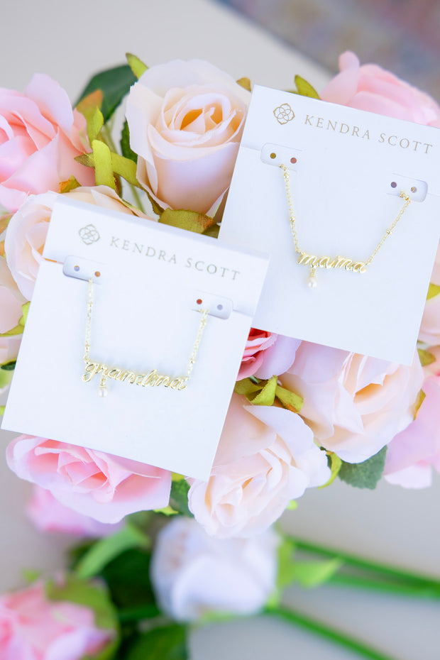 This Mama Script Pendant Necklace by Kendra Scott is a timeless and elegant piece. Crafted with a delicate script pendant and a pearl drop, it is the perfect way to show love and appreciation for grandmothers. Made with quality craftsmanship and attention to detail, this necklace is a meaningful gift for any occasion.