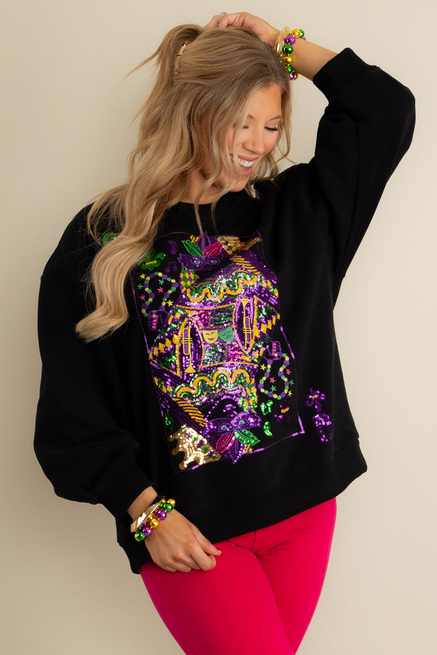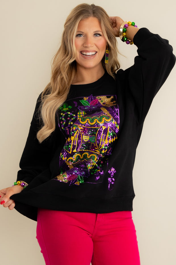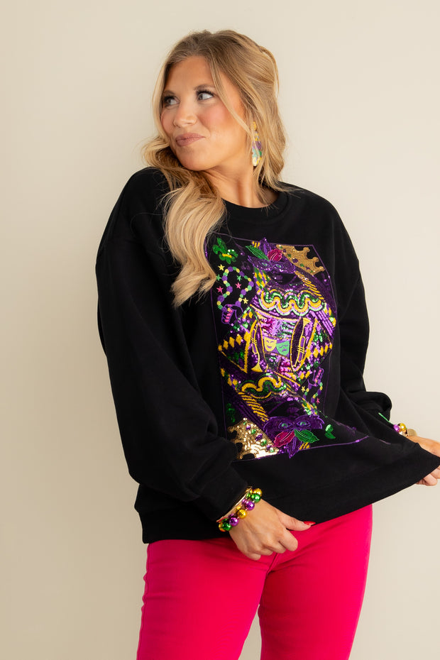 Stay cozy and glamorous this Mardi Gras season with our Queen Of Sparkles long sleeve sweatshirt. Made of soft fleece material, this sweatshirt features a round neckline and eye-catching sequin card detailing on the front. Perfect for showing off your love for the festivities in style.