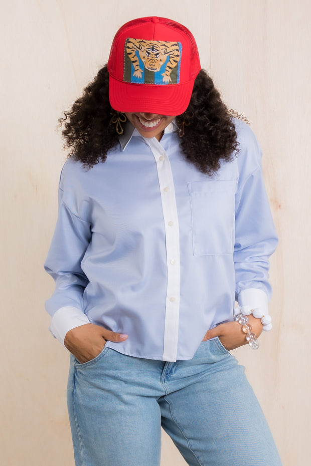 The blue and white striped print adds a touch of sophistication, while the top color and button-down design lend a professional look. Plus, the convenient front pocket allows for easy storage of essentials.