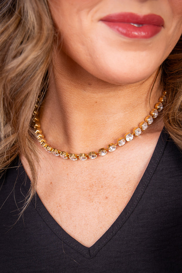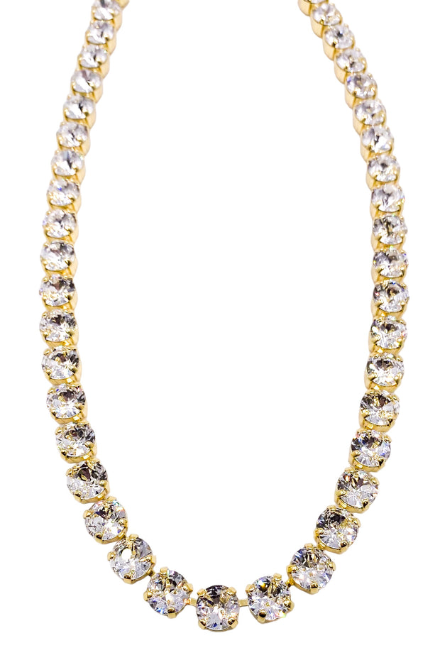 The Matilda Tennis Necklace features a repeating line of round cut crystals on an adjustable chain, secured with a lobster claw clasp. From Sorrelli's Crystal collection in our Bright Gold-tone finish.